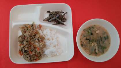 今日の献立は、「他人丼」「みそ汁」「ごまめ」「牛乳」です。
