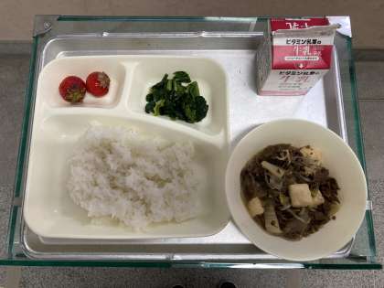 すき焼き煮・ほうれんそうのおひたし・いちご・ご飯・牛乳です。