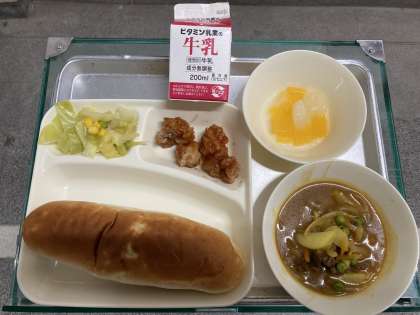 あげどりのバーベキューソース・カレースープ・キャベツとコーンのサラダ・フルーツゼリー・おさつパン・牛乳です。