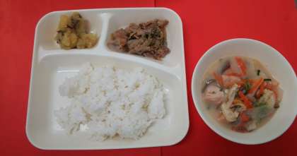 今日の献立は、「かす汁」「豚肉のごまだれ焼き」「くりきんとん」「ごはん」「牛乳」です。