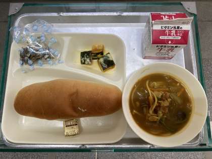 カレースープスパゲッティ、かぼちゃのマリネ焼き、ミニフィッシュ、コッペパン、バター、牛乳です。
