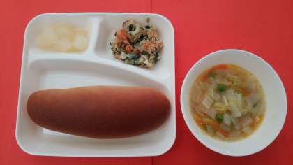 今日の献立は、「ほたて貝のグラタン」「スープ」「和なし(缶詰)」「黒糖パン」「牛乳」です。