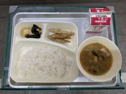 きびなごてんぷら、みそ汁、わかたけ煮、ごはん、牛乳です。