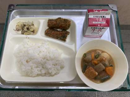 ちくわのいそべあげ、あつあげとさといものみそ煮、キャベツの赤じそあえ、ご飯、牛乳です。