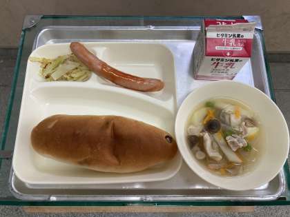 ウインナーのケチャップソース、スープ、焼きツナキャベツ、レーズンパン、牛乳です。
