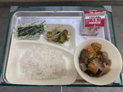 牛肉と野菜のいため煮、きゅうりともやしのおひたし、焼きのり、ご飯、牛乳です。