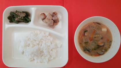 今日の献立は、「まぐろのしょうゆマヨネーズ焼き」「みそ汁」「三度豆のいためもの」「ごはん」「牛乳」です。