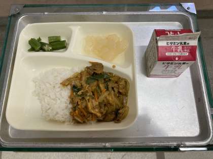 和風カレー丼、オクラの甘酢あえ、和なし(カット缶)、牛乳です。