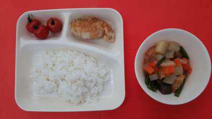 今日の献立は、「まだらのからあげ」「じゃがいもと野菜の煮もの」「プチトマト」「ごはん」「牛乳」です。