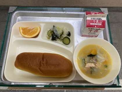 鶏肉とかぼちゃのシチュー、ミックス海そうのサラダ、オレンジ、パンプキンパン、牛乳です。