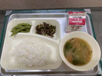 チンジャオニューロウスー、中華みそスープ、えだまめ、ご飯、