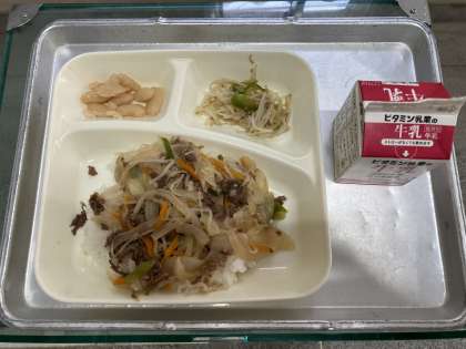 牛丼、もやしとピーマンのごまいため、大福豆の煮もの、牛乳です。