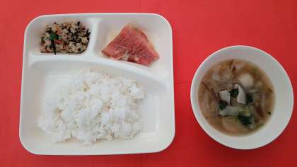 今日の献立は、「赤魚のレモンじょうゆかけ」「うすくず汁」「高野どうふのいり煮」「ごはん」「牛乳」です。