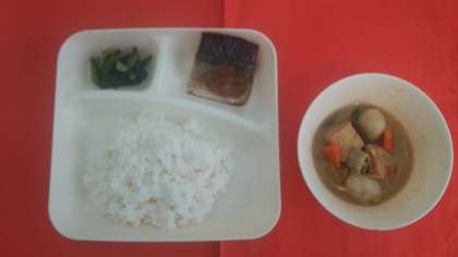 今日の献立は、「さばのおろしじょうゆかけ」「あつあげとさといものみそ煮」「ほうれん草のおひたし」「ごはん」「牛乳」です。