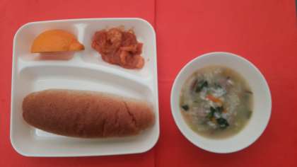 今日の献立は、「えびのチリソースいため」「中華がゆ」「デコポン」「ライ麦パン」「牛乳」です。