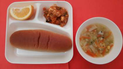 今日の献立は、「とうふのミートグラタン」「スープ」「はっさく」「黒糖パン」「牛乳」です。