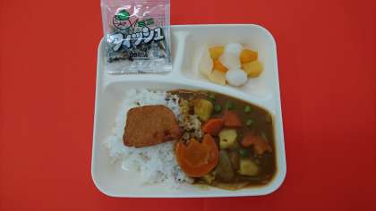 今日は新入生の入学をお祝いする献立です。「カツカレーライス」「フルーツ白玉」「ミニフィッシュ」「牛乳」です。。子どもたちの大好きなカレーライスに、一口トンカツをのせて食べます。春らしくチューリップのラッキーにんじんが入っていました。デザートは、ミックスフルーツの缶詰と、白玉だんごをあわせたフルーツ白玉です。毎回、子どもたちにとても好評な組み合わせです。1年生もとてもよく食べていました。