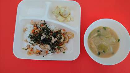 今日の献立は「かやくご飯」「みそ汁」「焼きじゃが」「牛乳」です。