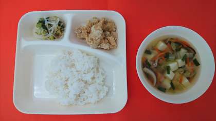 今日の献立は、「鶏肉のからあげ」「中華スープ」「チンゲンサイともやしの甘酢あえ」「ごはん」「牛乳」です。