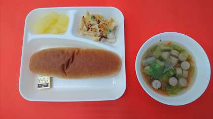 今日の献立は、「マカロニグラタン」「レタスのスープ」「りんご(缶詰)」「コッペパン」「牛乳」です。