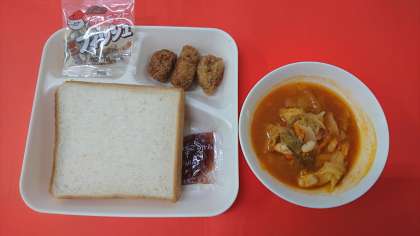 今日の献立は、「一口トンカツ」「ミネストローネ」「アーモンドフィッシュ」「食パン・いちごジャム」「牛乳」です。