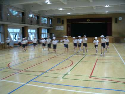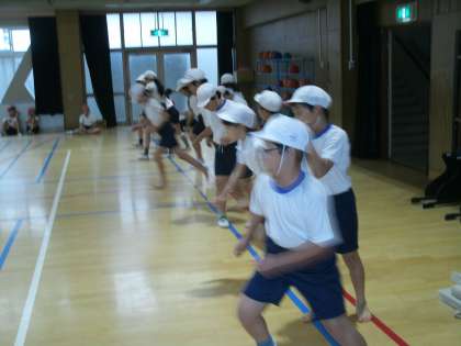 20メートルシャトルラン(持久力の測定)をしています。行ったり来たりをくりかえしています。