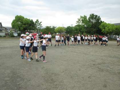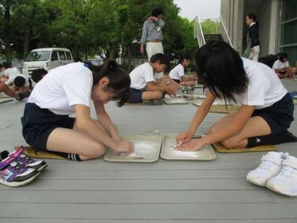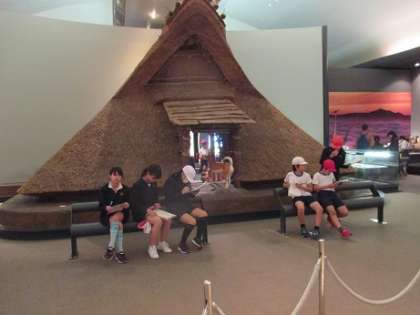 竪穴式住居をみんなで組み立て、石を削って勾玉を作りました。