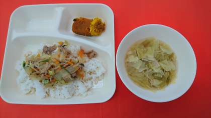 今日の献立は、「豚丼」「ゆばのすまし汁」「かぼちゃのしょうゆ焼き」「牛乳」です。
