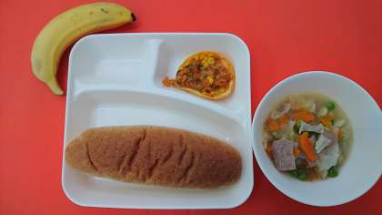 今日の献立は、「豚肉とキャベツのスープ煮」「変わりピザ」「バナナ」「ライ麦パン」「牛乳」です。