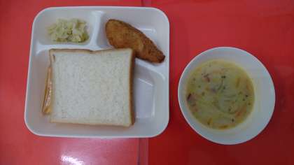 今日の献立は、「サーモンフライ」「豆乳コーンスープ」「キャベツのソテー」「食パン・はちみつ」「牛乳」です。