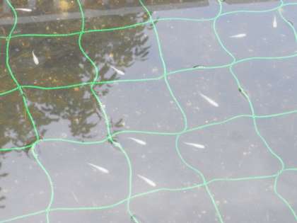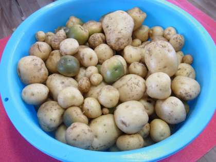 放流したメダカと学習園でとれたジャガイモの写真です。