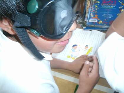 ゴーグルをつけて白内障や視野狭窄の体験をしています。