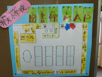 毎週火曜日、学校図書館補助員として新居さんに来ていただいてます。本を見つけやすいようにきれいに整理してくださいます。また、掲示物「図書館マップ」も作っていただきました。ページがバラバラになってしまった本はボンドではり合わせて修理してくださいます。