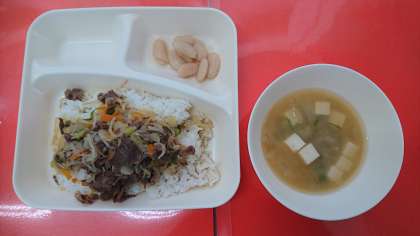 今日の献立は、「牛丼」「とうがんのみそ汁」「大福豆の煮もの」「牛乳」です。