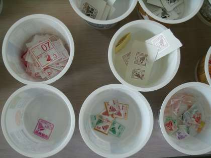 懇談会中 多目的室では ベルマークの整理が行われてます。