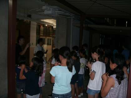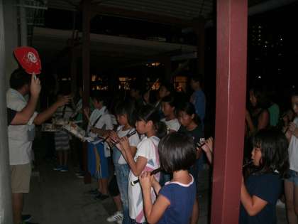 締め太鼓のリズムに合わせて笛を吹いていました。