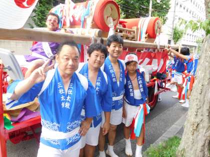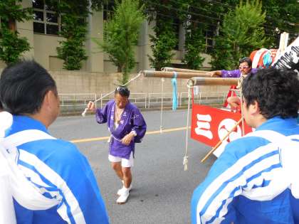 弁天小学校元PTA会長美淋さんより指導を受け、本校の片岡・石原・宇原の3名が太鼓をひくことになりました。現PTA会長の玉城さんと市岡中学の岡崎先生とともに鳥居前のやりまわしと宮入を行い境内をかけぬけました。