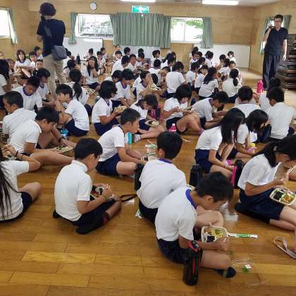 昼食をとっています。ハチ高原は少し雨が降っているそうです。この後の予定は空模様により2日目以降のプログラムと入れ替える場合があります。