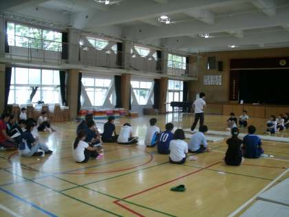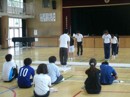 弁天小学校は大阪市の採用二年目教員の実技研修会場になっています。今日は、朝からマット運動やラジオ体操などの研修が行われ、約30名の教員が学んでいました。体育の模擬授業も行われていました。