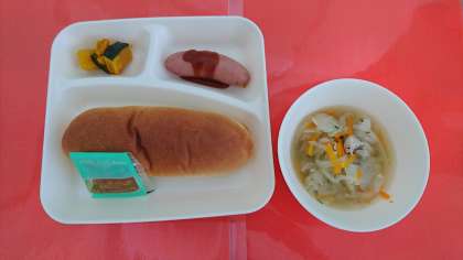 今日の献立は、「フランクフルトのケチャップソース」「スープ」「焼きかぼちゃ」「コッペパン」「りんごジャム」「牛乳」です。