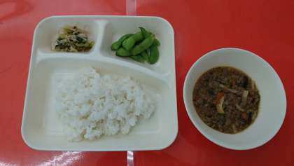 今日の献立は、「マーボーなす」「チンゲンサイともやしの甘酢あえ」「枝豆」「ごはん」「牛乳」です。