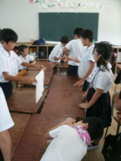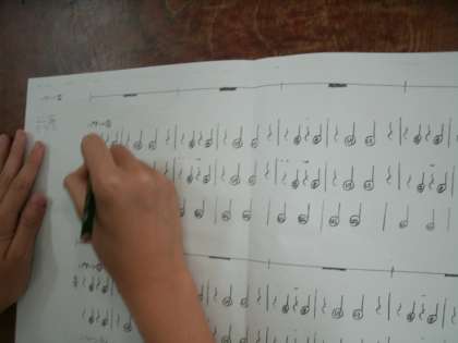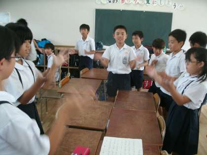 3パートに分かれて練習です。リズムよく、ひざや肩も両手で打ちます。