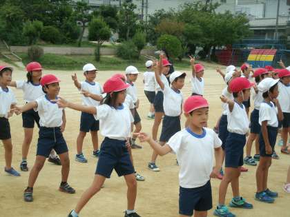 運動場で団体演技の練習をしています