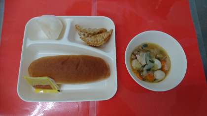 今日の献立は、「中華煮」「あげギョーザ」「なし(豊水)」「コッペパン」「アプリコットジャム」「牛乳」です。