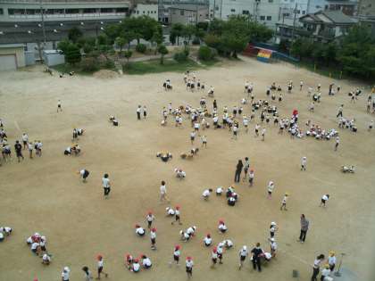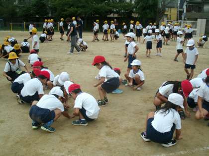 運動場のすみずみまで、小さな石も見つけて拾います。