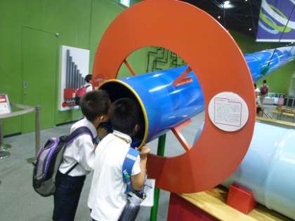 長いチューブの中で手を叩くと、響いて不思議な音がきこえます。また、自分の足で電気を起こすコーナーもありました。