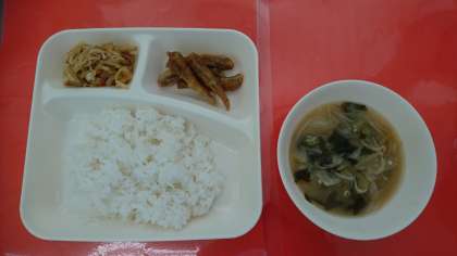 今日の献立は、「いわしてんぷら」「みそ汁」「切り干しだいこんのいため煮」「ごはん」「牛乳」です。いわしてんぷらは、油であげたいわしてんぷらに、砂糖、みりん、酢、こい口しょうゆで作ったタレをかけます。ご飯によく合います。