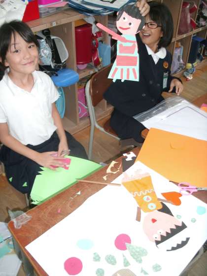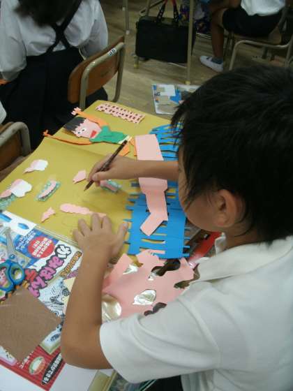 色画用紙をはさみで切って、貼り付けて製作中です。