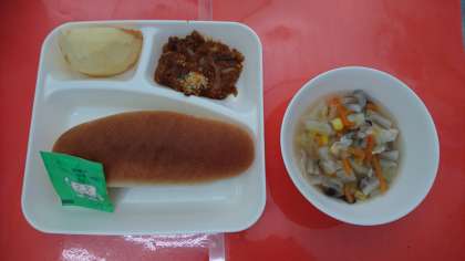 今日の献立は、「なすのミートグラタン」「鶏肉と野菜のスープ」「りんご」「大型コッペパン・マーガリン」「牛乳」です。なすを、ケチャップ味のグラタンにすることで、苦手な子どもにも食べやすい献立になっています。