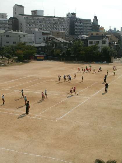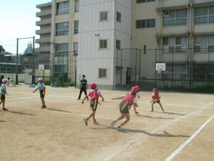 タグラグビーに取り組んでいました。チームで練習し、試合をしていました。